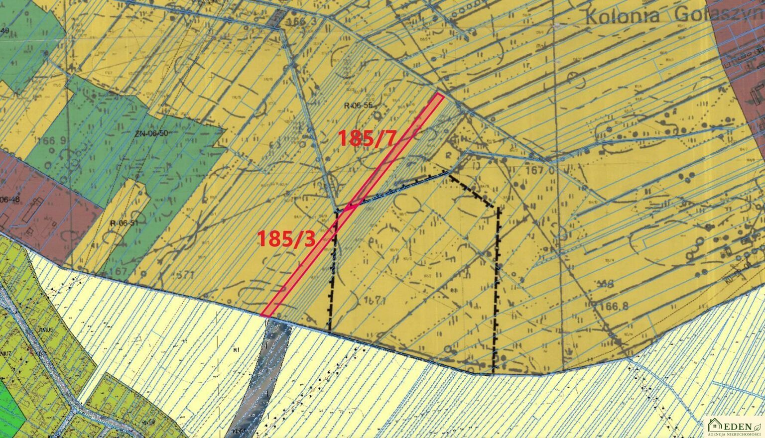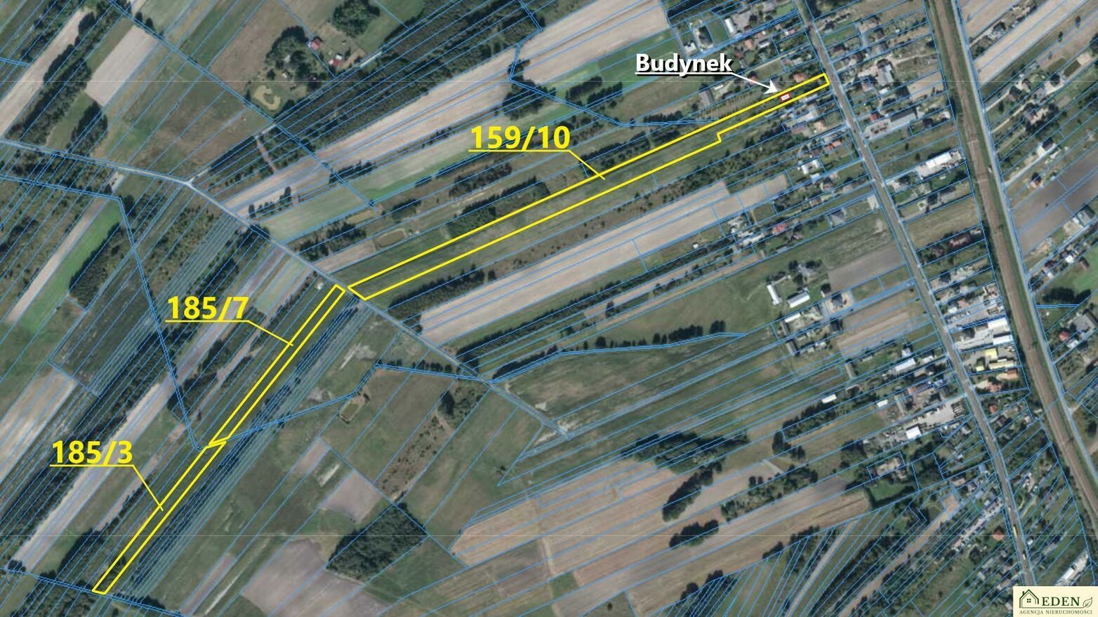 Nieruchomość składa się z dwóch działek o numerach ewidencyjnych 185/3 i 185/7, o łącznych wymiarach około 15,5 m szerokości i 575 m długości.