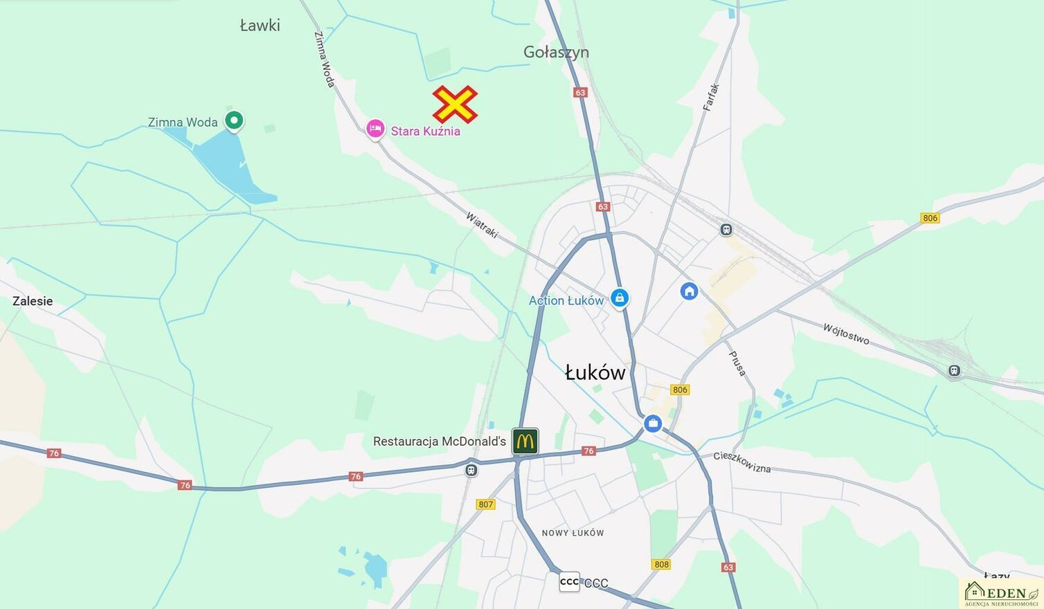 Działka znajduje się pomiędzy dwoma skupiskami zabudowań około 400 metrów od strony Łukowa (ul. Zimna Woda) i około 750 metrów od strony Gołaszyna.