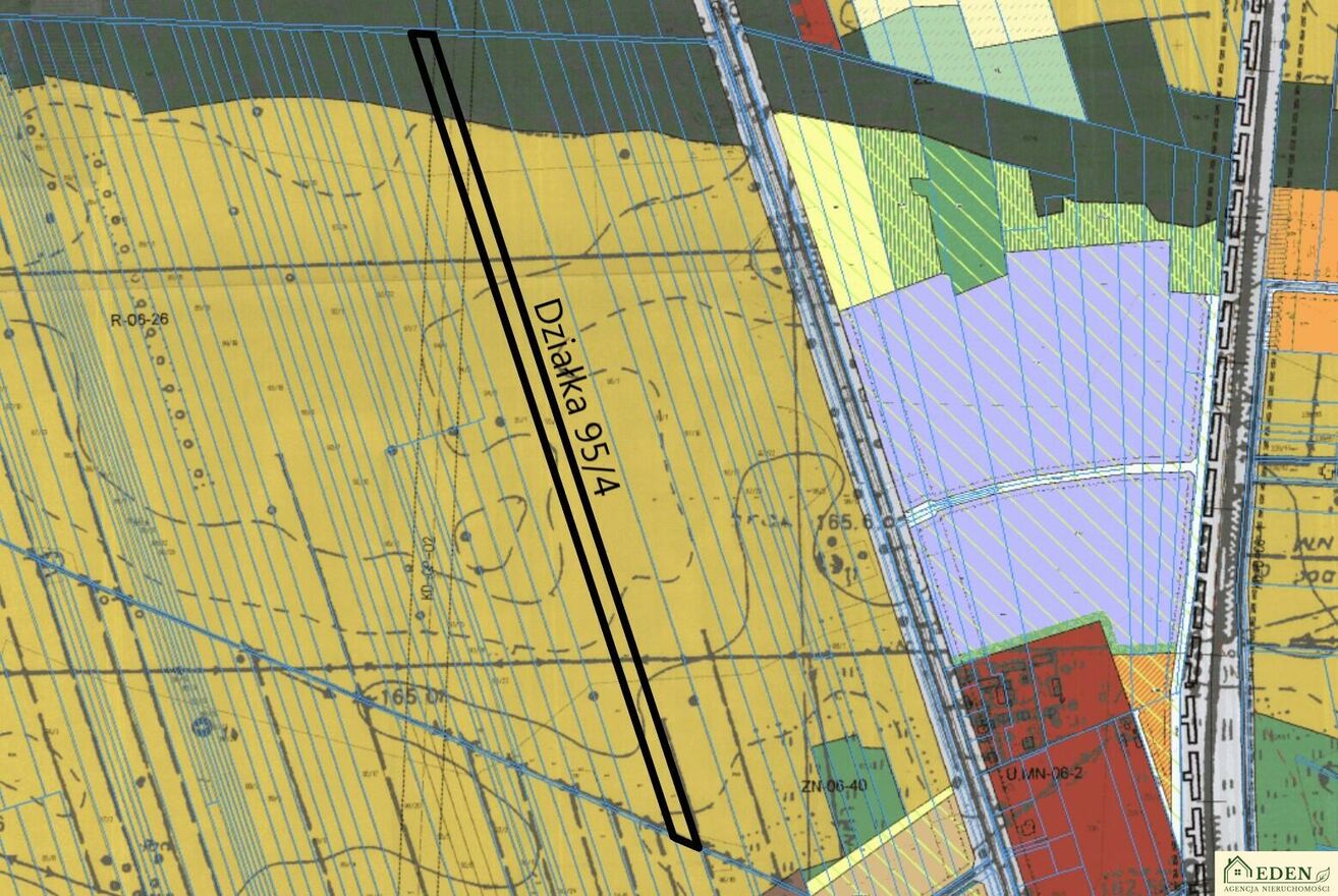 Działka nr 95/4 o powierzchni 1,9012 ha i wymiarach ok. 22,5 m x 870 m stanowi w przeważającej części tereny rolne oznaczone w MPZP symbolem R (ok. 1,7 ha) oraz w części lasy Ls (ok. 0,2 ha).